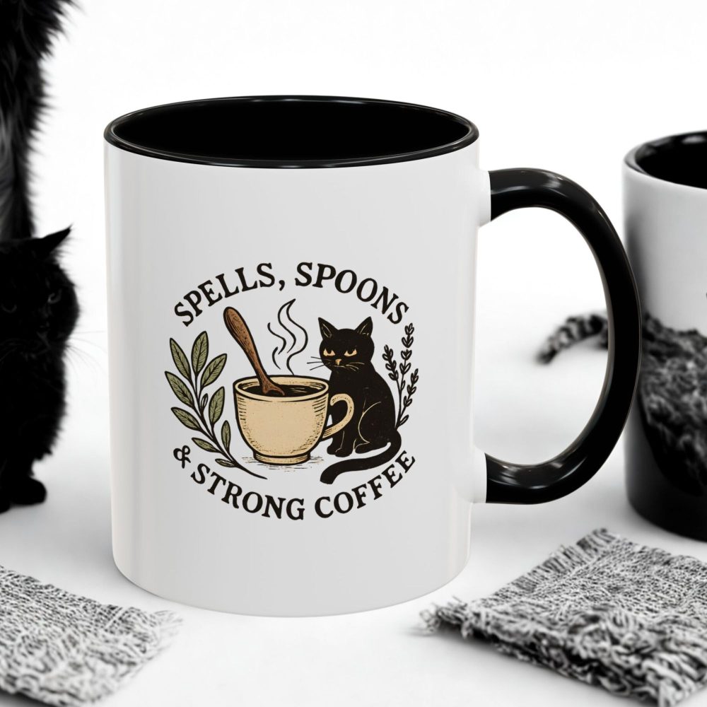 • “Spells, Spoons & Strong Coffee” with a black cat and magical brew design